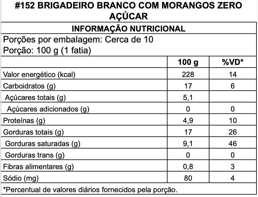 Bolo de massa integral, recheios de brigadeiro e mousse branca zero adição de açúcares com morangos, cobertura de mousse branca zero adição de açúcares e morangos.