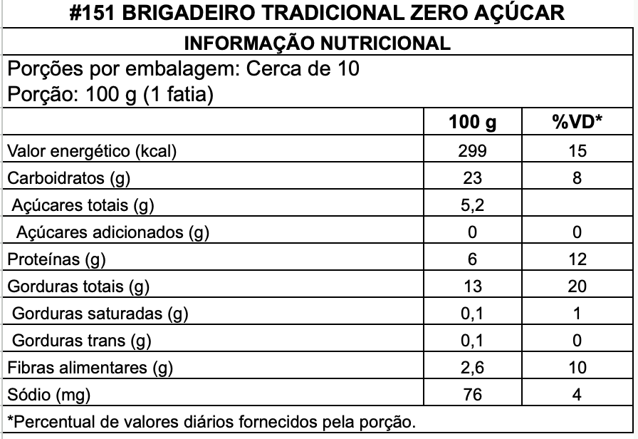 Bolo de massa integral sabor chocolate, recheio de brigadeiro zero açúcar, cobertura de trufado de chocolate ao leite zero açúcar, finalizado com brigadeiro (docinho) zero açúcar.