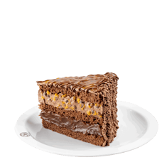 Bolo de massa de chocolate, recheios de mousse de chocolate e creme gelado, cobertura de mousse de chocolate, calda de chocolate e cerejas (decorativas).
