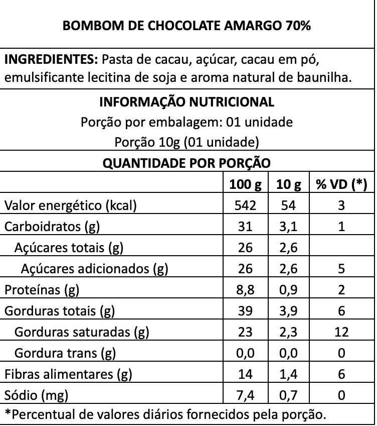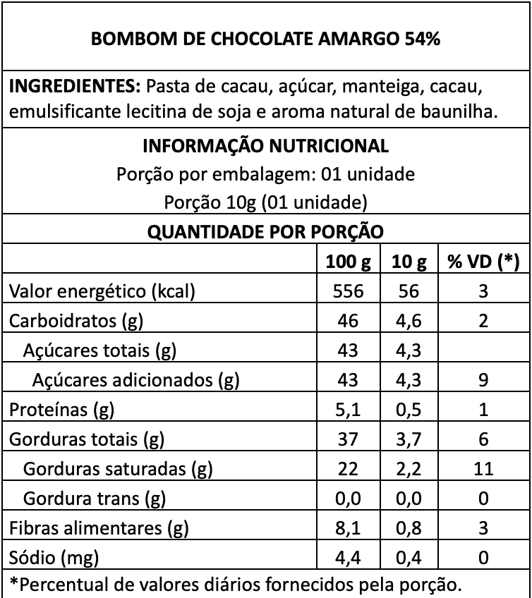 Bombom de chocolate ao leite, bombom de chocolate branco, bombom de chocolate amargo 54% e bombom de chocolate amargo 70%.