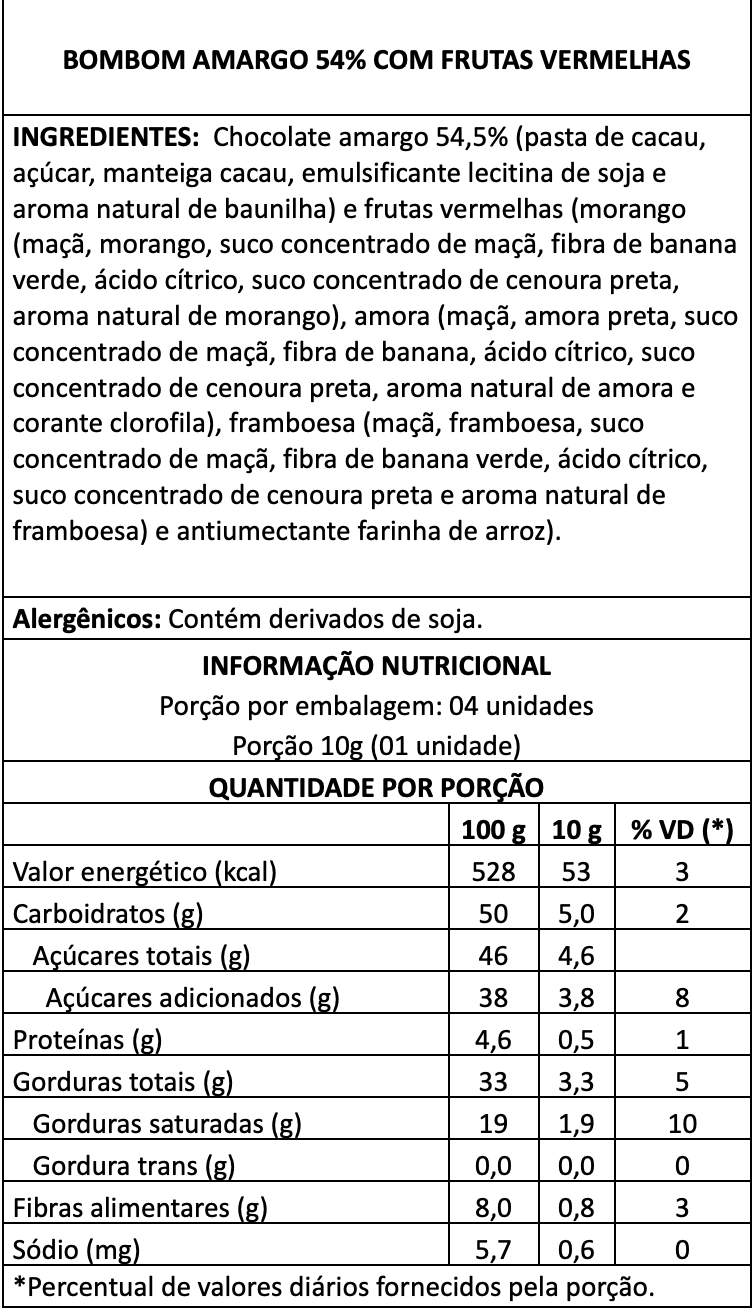 Bombom de chocolate ao leite com laranja cristalizada, bombom de chocolate branco com frutas vermelhas e bombom de chocolate amargo 54% com frutas vermelhas.