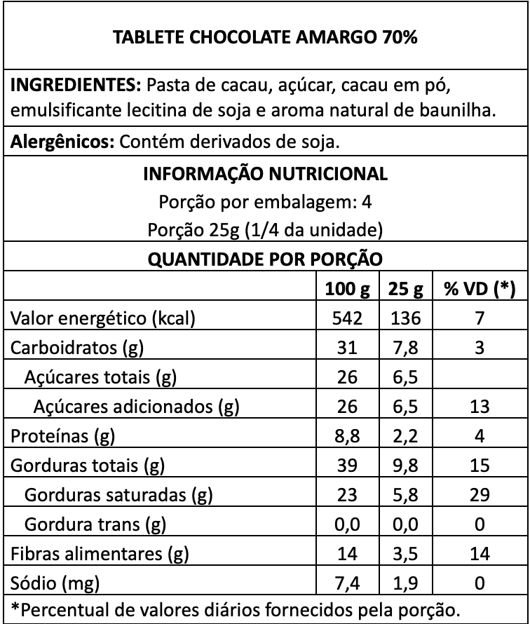 Tablete Amarga 70% 100g