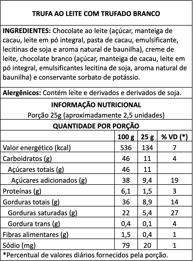 CONTÉM LACTOSE. NÃO CONTÉM GLÚTEN. ALTO EM AÇÚCARES ADICIONADOS E GORDURAS SATURADAS. ALERGÊNICOS: CONTÉM LEITE E DERIVADOS E DERIVADOS DE SOJA.